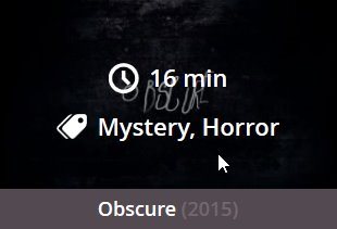 • Genres: There are a total of 16 genres among which the short films are divided. Some of the popular ones are action, comedy, horror, drama, romance, animation, etc. Each genre will show movies laid out in a tile format. When you hover over a film tile, it will show its duration and genre.shortfil film tile