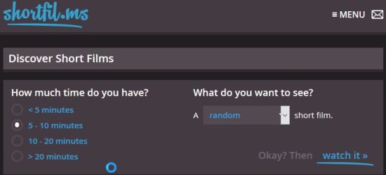 Shortfil.ms is a website which has a compilation of best short films on the web. The website lets you choose a short film based on the amount of free time you have. Yes, you read it right, you can actually select the duration of the short film from the given radio boxes on the top of the website. You can select among duration less than 5 minutes, 5 – 10 minutes, 10 – 20 minutes, and more than 20 minutes. You can easily watch a short film online depending on the free time you have.