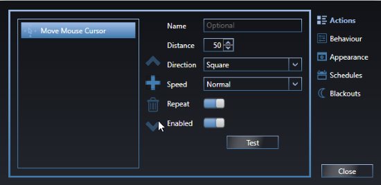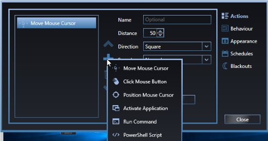 The right side of the app window has all the options which you can select like actions, behavior, appearance, schedules, and blackouts. When you select actions, you will need to click on the plus icon given for a list of actions to come up, this can be seen in the screenshot above. The list of various actions which can be performed are listed. Choose the one which you want. Let’s start by selecting move mouse cursor. After selecting this, you can change the given options like distance you want the mouse cursor to move, direction you want the mouse cursor to move in, speed in which it should move, whether you want this action repeated, etc.