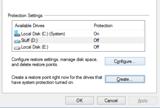 Step 3: The System Properties dialog box should come up, with the System Protection tab already focused. Click on the Create button, and you’ll be prompted to enter a descriptive name for the restore point. Do that, and click Create. Here’s a screenshot: