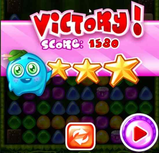 The level complete screen is shown above, which displays your total score and the number of stars you earned out of three. The replay button lets you retake the level for better scores and the play button will take you to the levels screen from where you can move on to the next level.