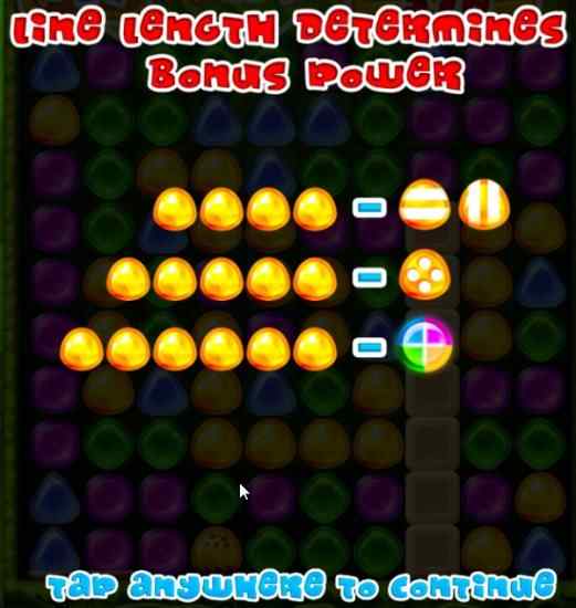 There will also be a screen like the one shown above which will tell you how many candies form what kind of a special candy. Like 4 candies will form a special candy with two lines on it, which can eliminate a whole line. 5 candies in a line will form a special candy with dots which will remove all the surrounding candies like a blast effect.