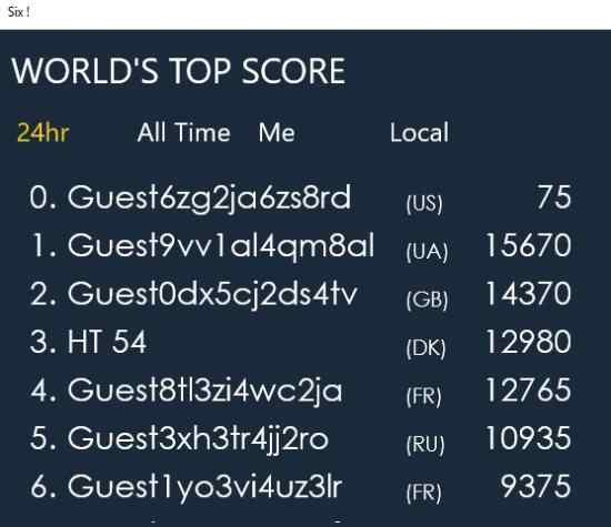 You can see here your best and current game score. The buttons at the bottom are for viewing the leaderboards and for replaying the game. When you click on the leaderboard button, you will be shown a screen like below.
