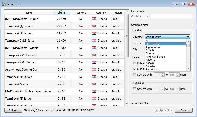 TeamSpeak will detect automatically from which country you’re coming from and it will offer you public servers closest to you, to increase speed and responsiveness. Use the filtering options in the right sidebar to change server location or use the search tool to find a specific server where you and your friends and contacts have decided to meet.