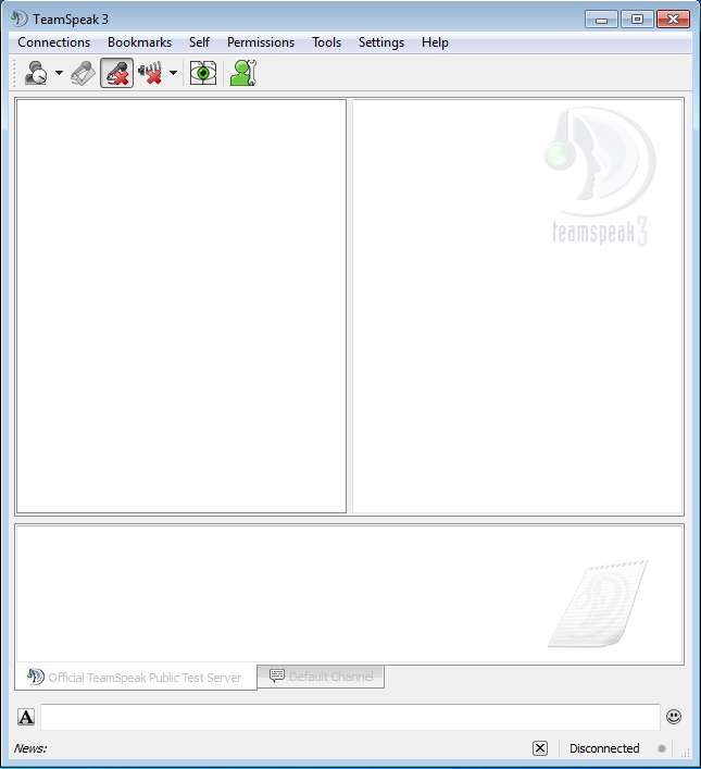 In the image above you can see the interface of TeamSpeak. Before you can reach this point, you’ll have to go through a six step wizard. Main menu of this free group voice chat software is located at the top, while down below you can see three empty areas. The two in the middle, which occupy the bulk of the area, are for listing available contacts on the server that you’ve connected to (the one on the left) and for exchanging messages (the one on the right). Empty window at the bottom is where status updates are located, when someone connects to the server or leaves.