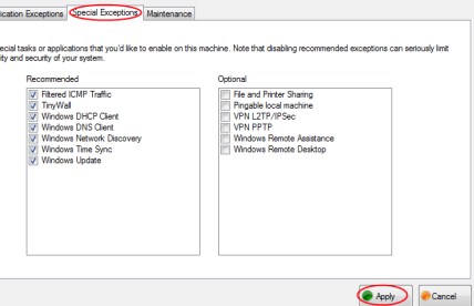 Special Exceptions: Just next to Application Exceptions, there is Special Exceptions option available. Using this option, you can select those tasks/applications which you want to make enable on your system. It shows you two sections such as: Recommended (having windows update, windows DNS client option etc. ) and Optional. Select applications according to your own intelligence and perform actions.
