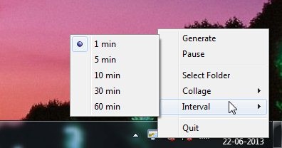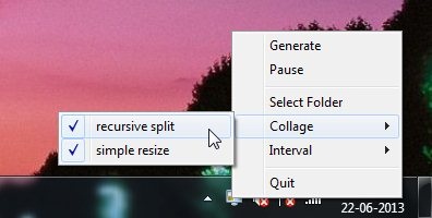 Wpmaker sits silently in your system tray area and keep working from there until you exit it. It contains some right-click menu icons which helps you in manually changing the wallpapers, modifying the time duration for changing wallpaper, pausing the wallpaper change, enabling/disabling recursive split, etc.