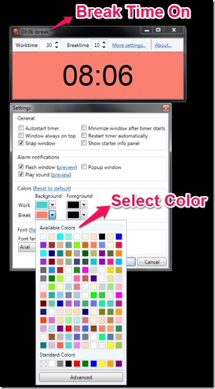 In Reliak Timer, the Work-time ranges from 5 to 480 minutes and break-time ranges from 0 to 120 minutes. The format of the timer is of “hour: minutes: seconds”. Reliak Timer provides settings that can be customized according to your wish. The general setting allows to check the box and schedule the timer window accordingly. The alarm notifications enables you to hear alarm with ringing bells or you can also have the flash window. Pop-up window can be used when you are working with deep concentration and you seriously need a break.