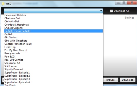 You can see interface of WKD in above screenshot which is quite simple and doesn’t provide much options. You will find a drop down menu option that will provide you all the available web comics to download. You can either download all comics in one go or can select desired one.