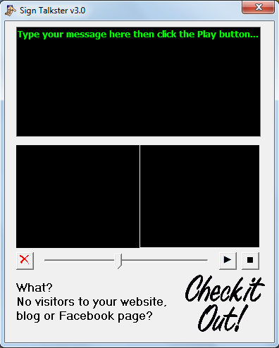 Once you launch the application you would see a blackish interface with text at the top. Below that you have two black areas where each of them represent the window for the sign language and the text which it represents. At the bottom you have the play button along with the option to change the speed at which each text is presented through the sign language.