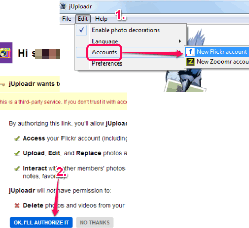 Its interface is very simple to use. To upload photo, you first have to authorize your Flickr account to jUploadr to access your account. It is a very simple process and requires only few easy steps. First, use Edit menu to add your Flickr account. After this, it will open a webpage where you can sign in to your Flickr account.