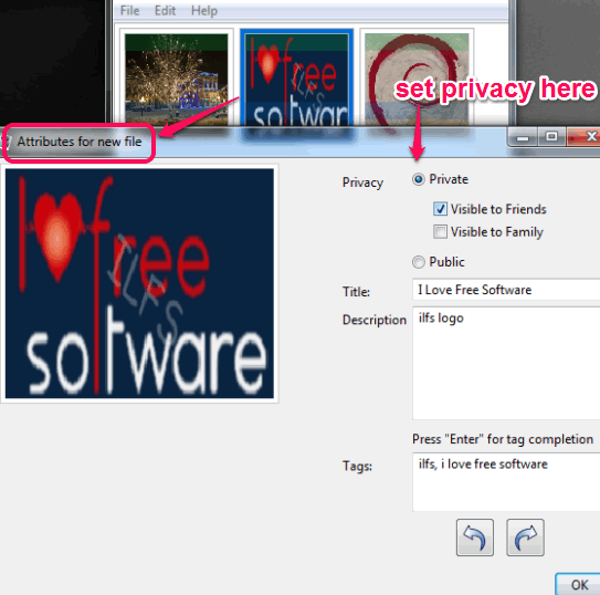By default, photos remain in public mode. But you can set privacy of each individual photo as private. For this, double-click on a photo. A new window will open up, just like visible in below screenshot. In this window, you can set privacy to upload photos with private mode and set visibility to friends or family.