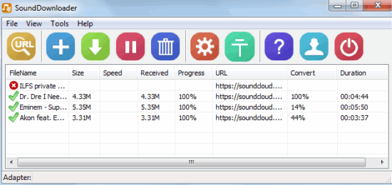 SoundDownloader is a free SoundCloud downloader software that helps you to download multiple songs from SoundCloud together. You only need to add URLs of required SoundCloud files and it will automatically start downloading those files for you.