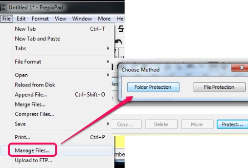 File menu is one of the essential menu that is helpful to open a new tab/file, create a clone tab of active tab, insert multiple files to merge them as a single text file, upload files to FTP server (requires Host URL, username, and password), and to save files as pdf or as rtf format. This can also be used to protect any file or folder available on PC, without any password. No one will be able to open protected files or folders, until it is unprotected back using this text editor.
