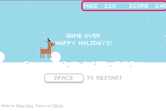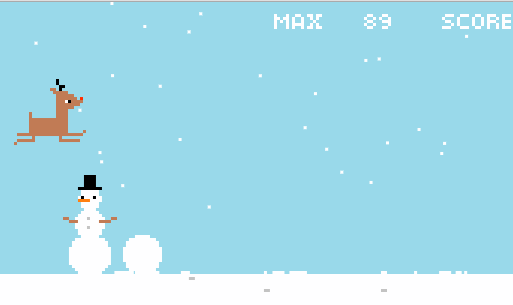 When the obstacles will come, you have to press the space key or Up arrow key at correct time to make the reindeer jump. Obstacles come in the form of snowball and snowman. So the full game is based on Christmas. When two or three obstacles come with a very short gap one after another, then try to press and hold the space key. Otherwise, the cute reindeer will touch one of those obstacles and your game will be over.