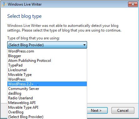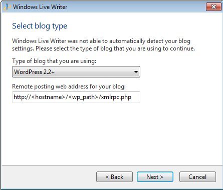 - In case you get the message, Windows Live Writer was not able to detect your blog settings, select your blog service from the first drop down menu
