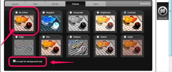 Among the 9 effects you can select the desired effect which you wish to apply on the banner image. It provides you a check box which you can check to apply the effect on the background ignoring the text. If you are least interested in applying effects, then you can choose the first thumbnail “No effect” and proceed to grab the banner image.