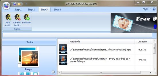 The third step lets you attach an audio file to the slideshow. You can add one or more audio files to the slideshow, and preview them before proceeding to the next step.