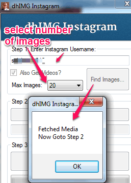 After entering your Instagram username, select the total number of images you want to fetch from presets (20, 40, 60, 80, 100, 200, and 500). As soon as a preset is selected by you, Find images button will become activated. Using this button, you can start fetching images and videos from your account.