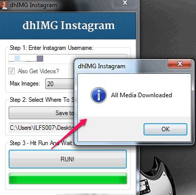 Step 3: This is the final step to begin the download process. Just click on RUN! button. All images and videos (if option was enabled by you) will start downloading to selected destination location.