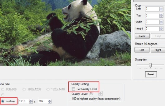 And for adjusting size of an image, you can find the preset sizes and custom size option at the bottom part on its interface. Give a desired size to your image and change its quality level (if needed).