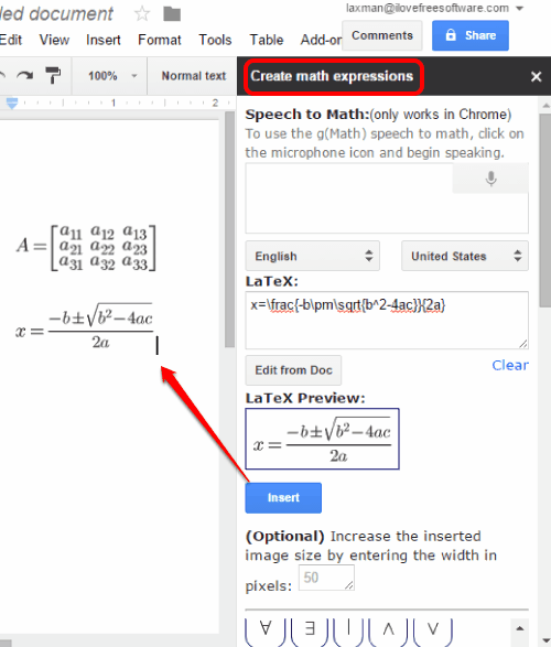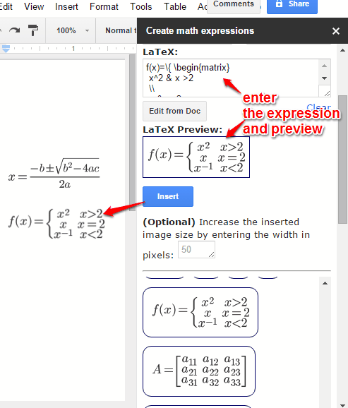 create and insert Math expressions and graphs in Google Docs document
