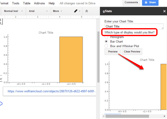 • It has also provided feature to insert a Histogram and/or Bar Chart. All you need to do is enter the data in the available box using the sidebar, select the type of display, preview the output, and insert in the document.