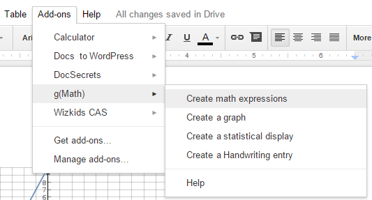 Use this link to install g(Math) add-on. When you have installed it, open a new document, and click on Add-ons → g(Math). Under g(Math), four different options will be visible to you: Create math expressions, Create a graph, Create a statistical display, and Create a Handwriting entry.