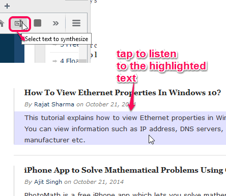Automatik Text Reader is a free Firefox Text to Speech add-on to read online text online. Unique feature that makes this add-on more interesting is that it can auto select a paragraph, line, or heading, and start reading that text. Thus, you can use this Firefox add-on either by selecting the required text or by placing mouse cursor to required text.