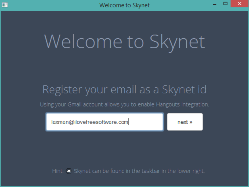 Step 1: Download this software using the link presented at the end of this review. Install this software and run it. While running it for the first time, you need to register your email address as Skynet id. See the screenshot below.