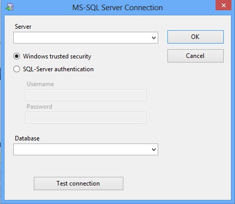 First thing that you need to do is connect to the SQL server that you presumably have running. Select server name and database down below and click OK. If you don’t have SQL server running, free version can be downloaded from Microsoft pages.