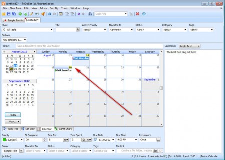 Right click anywhere in the empty list area and select New Task. Enter the task title, at the bottom you can set time limits which the task is gonna have, for example due date and time, and you can even keep track of the task completion in percentages. In the right column you can add task comments, if they need to be explained in greater detail. By switching to the Calendar tab, all your task will be marked in a calendar: