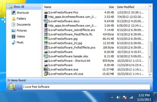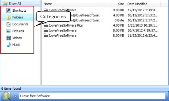 Quick search also provides a category panel on the left where it keeps a separate type of files in separate categories. These categories include Shortcuts, Folders, Documents, Pictures, Videos, and Music. You can click on any of these categories to further filter your search (if you know what kind of file you are looking for).