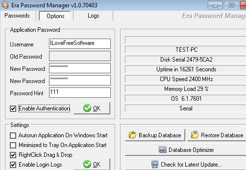 Era Password Manager is a free portable password manger for Windows. Passwords can be saved and protected with the help of a password protected database, so you’re basically protecting passwords with passwords. Right click drag and drop can be used to insert usernames and passwords to websites without having to type them again, and risk them being collected by keyloggers.