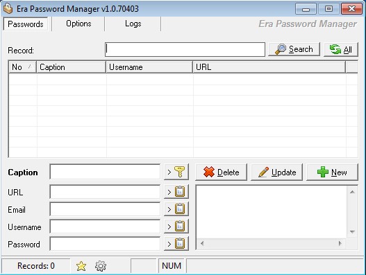 Interface of Era Password Manager is packed. Tabs in the top left corner of the screen will allow you to switch between stored passwords, options and status window. Large empty area below the search box is reserved for the passwords that you decided to store in this free password manager. Username, password, website, and all the info about the online account that you are adding will be filled out down below.
