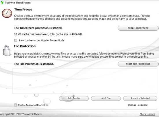 Toolwiz Time Freeze also has a feature that allows you to select files and folders for protection. This feature allows you to select whole folders or individual files for protection. This feature protects those files and folders that you select from being secretly transferred or copied from your computer malicious software such as Trojans and worms. It also keeps those files and folders safe from prying eyes and local copying by unauthorized users.