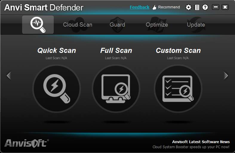 Program has a very simple to use interface with a slick black design. When you first start the program, you will immediately be offered to either have a Quick Scan, Full Scan or Custom Scan. What these are you probably know, so why don’t we have a look at some of the other interesting options that Anvi Smart Defender has to offer.