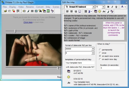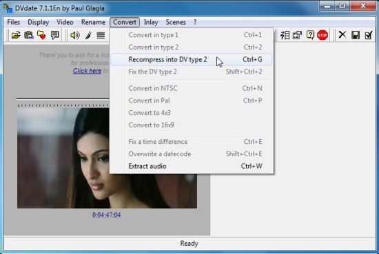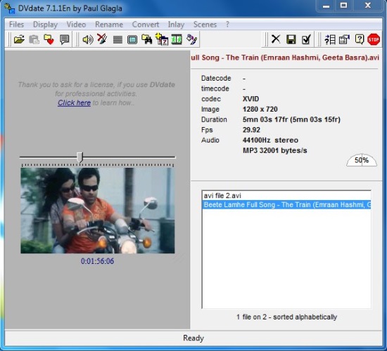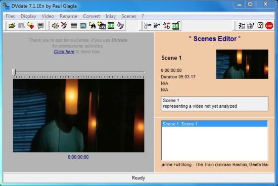 DVdate comes with a built-in media player that plays the AVI file for you, and lets you manage file properties and individual scenes. It is capable of extracting two important properties (if available) of an AVI file: timecode and datecode, and embedding them in individual frames of the video. These can also be used to create subtitles for the video clip. Apart from that, it allows you to easily convert an AVI DV file into multiple formats, including type 1, typ2, DV type 2, NTSC, and Pal. You can also create a file listing scenes from the AVI DV video and export them to some other formats like plain text, spreadsheet, doc, or some Open Office formats.