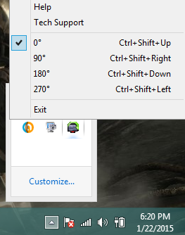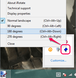 iRotate is another standalone application that works only from the system tray. After installation, you can right-click on its system tray to access its options. It provides options to rotate screen 180 degrees, 270 degrees, 90 degrees, and back to Normal landscape mode.