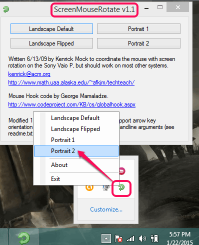 ScreenMouseRotate is a standalone and portable software to change screen orientation. After execution, it silently runs in the system tray. You can either right-click on its system tray or use its interface to rotate the screen. You will find Portrait 1 (rotate anticlockwise), Portrait 2 (rotate clockwise 90 degrees), Landscape Flipped, and Landscape default options. It is very lightweight software, only 19 KB.