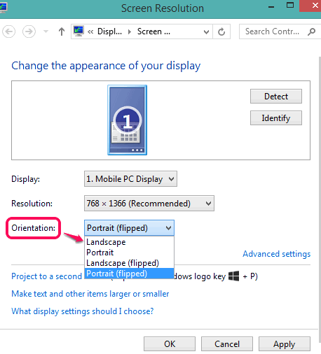 Right-click on your computer screen to access Screen Resolution option. Clicking on this option will open a window to adjust appearance of your display. There, you will find Orientation option that provides: