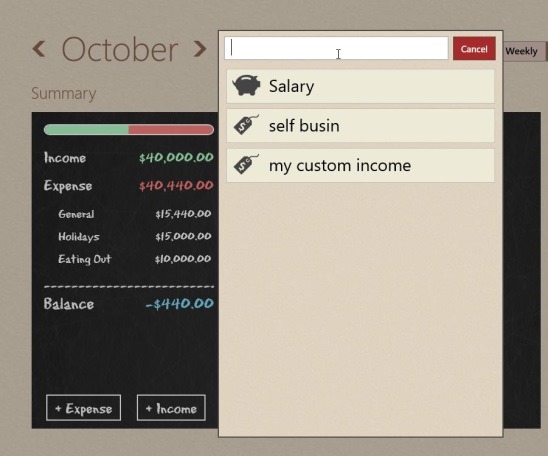 Also the app makes use of big icons and fonts, that are easy to read or understand. This could be a good point of this Windows 8 expense manager app for weary eyed people. There are well enough categories inbuilt within the app; that you can tag with the entries. The income category, by default has only one category: Salary. But you can create your own custom category for income entries. You can do that when your are adding an income entry, there’s a Category field; simply type your custom category in there and then fill rest of the fields, finally save the entry. This new category will be visible in rest of the entries.