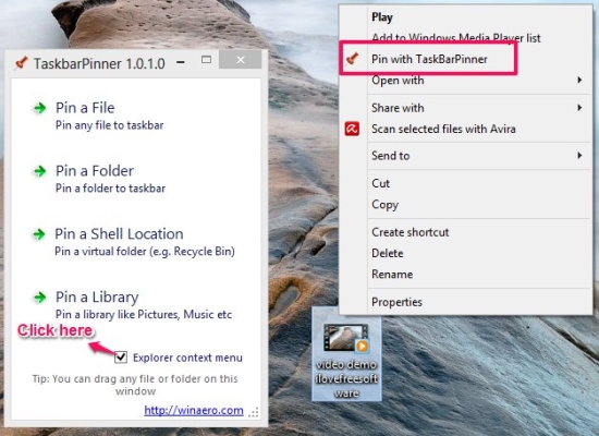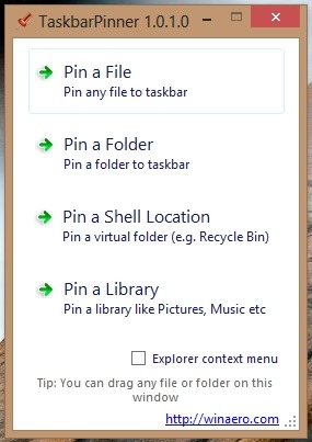 - One of the best feature that I like about this is the ability to integrate with the explorer context menu as shown in the screenshot below. In this manner you can pin anything that you come across with just a few clicks with Taskbar Pinner. To turn on this feature just put a checkmark on the applications interface as shown below.
