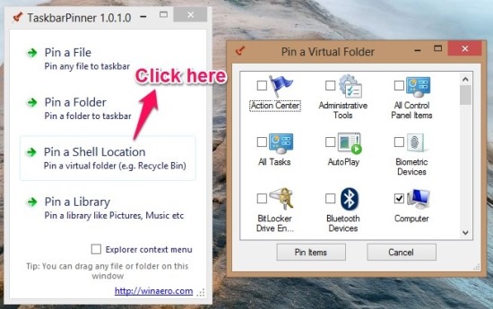 - As an example I am going to pin a shell location for the options. To do so just click on the Pin a shell Location button as pointed out in the screenshot, now you will be presented with the set of option as shown below. Just select whatever you like and it will be pinned to the taskbar in Windows 8. In this manner you can pin anything to the taskbar in Windows 8.