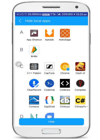 Step 2: After that, you’ll see a list of Android apps. You can only select one app at a time. Select an app to hide and tap on the “HIDE” button. This app will then hide this app within its interface and prompt you to uninstall it from the phone. After hiding the app, you can only access it through PrivateMe.