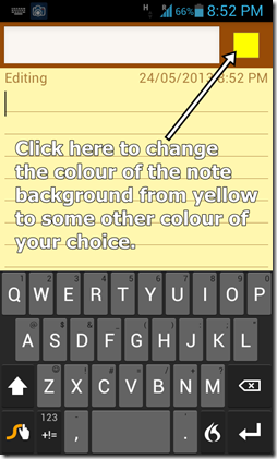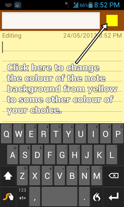 - When you click on the + button, you can create a new note. You are presented with an option to either create a Text Note or a Checklist. When you select Text Note from the popup that appears, the following screen opens up. Here, the default colour of the note is set to yellow, but you can change this by clicking in the top-left box where you see the yellow color icon, and select a color that you want for the note. By tapping on the top bar, you can set a title for the note, and then you can start typing in the content box. This note editing page looks like the following screenshot.