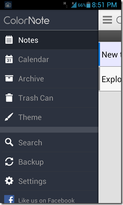 - When you open the ColorNote app, you will be shown with a screen which already has 2 notes built in: “New to ColorNote” and “Explore ColorNote”. You can see these notes in the below screenshot, where several button functions of this app are also explained. When you tap on these notes, you can open them and view their contents. From this screen, you can add new notes (by clicking + button) or search for notes (by clicking magnifying glass icon). You can also view more menu options by clicking the three lined button on the top-left.