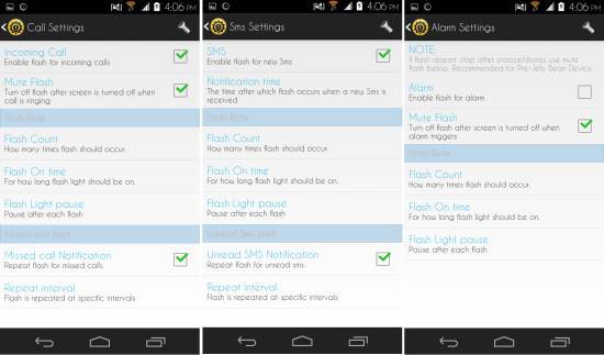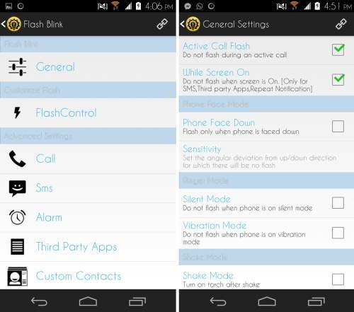 Tap on the settings button located on the upper right corner to see the options as seen here. Tap on the general settings to access options like flash while the screen is on, do not flash while in a call, face down mode, ringer options, and more. Using these options, you can customize the behavior of the flash light notification.