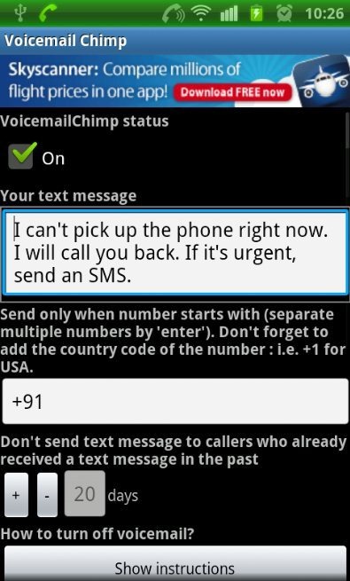 Voicemail Chimp is a free Android app to send SMS automatically, when any particular call is not answered. This is an awesome app in Android Market to revert to any missed call when you are busy in the form of a text to the caller. With Voicemail Chimp, it becomes easy to convey the caller that you are busy and will not be able to pick the call.
