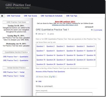 Apart from providing old GRE practice tests, this free website has also updated itself with new GRE practice tests. The tests have been categorized into various categories such as GRE reading comprehension, GRE math problem solving, GRE sentence completion and many more. This website is absolutely a must for each and every student preparing for GRE. It will definitely help you score best during the real GRE exam.